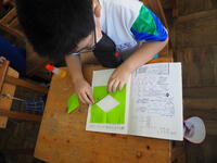 5年2組 家庭科 糸通し、玉結び、玉どめの練習をしました。