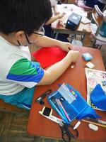 6年1組 家庭科「ナップザックを作ろう」ミシンを使ってナップザックを作りました。