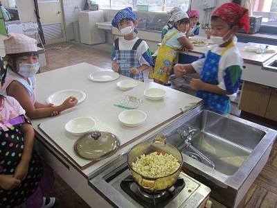 朝から、わくわくしながらポップコーンを作りました。ポップコーンがお鍋ではねている様子を見て「はねてるよ。すごい、すごい。」と大きな声を出して喜んでいました。また、音もなり、「なっている、なっている。」と驚いていました。ポップコーンができあがると、「いいにおい。」と言って食べていました。自分たちの作ったポップコーンのおいしさは、また格別だったようです。「おうちで、またつくってみるよ。」と言って喜んでいた子どもたちの笑顔がとても印象的でした。バンダナ・エプロンの準備等ありがとうございました。