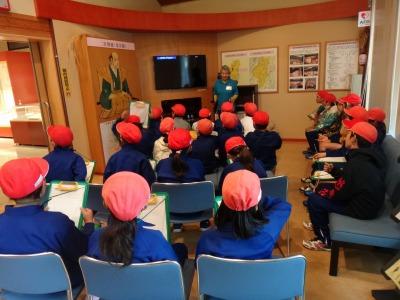 生活科「SL体験乗車」の学習で、茂木までSLに乗って行ってきました。SL乗車前に、真岡駅のキュウロク館を見学しました。茂木駅までの車中では、停車する駅名を調べたり、車窓からコスモス畑や稲刈り間近の田んぼなどの景色をながめたりしました。茂木町の並松公園で昼食をとり、遊具や芝滑りで遊びました。