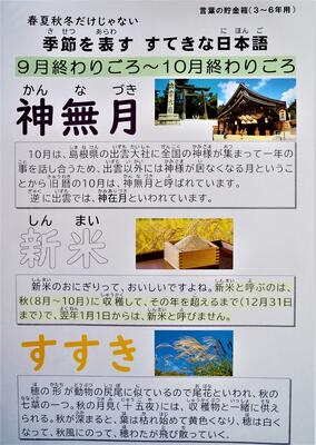 すすきやお団子をお供えしたご家庭もあったかと思います。十三夜と言われるお月見もあります。今年は10月8日(土)が十三夜になります。十五夜の月を見たら、十三夜の月も同じ場所で見ると縁起がよいそうです。お月見をして、月の形や見え方をご家庭で話してみてください。
