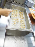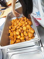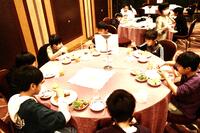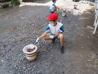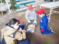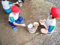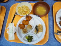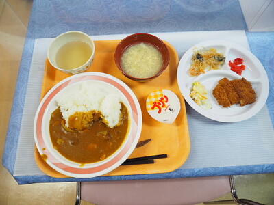 夕食のメニューはカレー、ポテトサラダ、フライドポテト、メンチカツ、卵スープ、プリンでした。お代わりをする子がたくさんいました。夕食後のキャンプファイヤーが楽しみです。