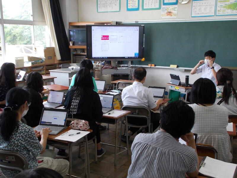 学力向上の研修では、学力向上推進リーダーの先生から、ICTを活用した学習指導について話を聞きました。