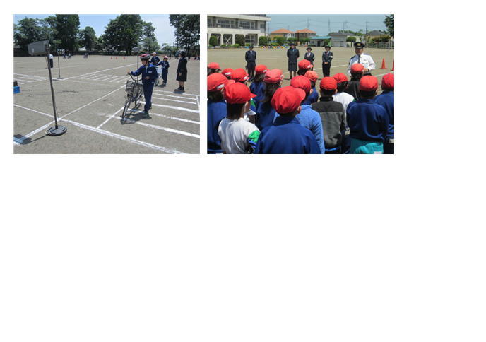 1・2年生は、道路の歩き方について、3年生以上は自転車の乗り方について、校庭の模擬道路を使って学習しました。
