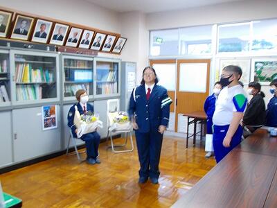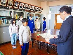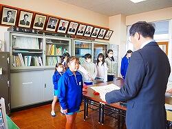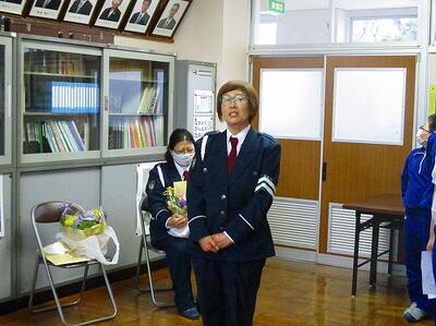 感謝する会では、児童代表のお礼の言葉や校長先生の話のあと、子どもたちからの感謝の手紙と花を交通指導員さんにお渡しして、交通指導員さんからお話をいただきました。