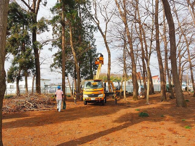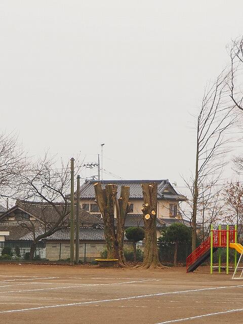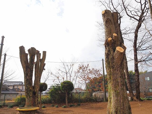 昨日から始まった校庭の樹木の伐採です。校庭南に2本の「けやき」の上部がきれいに伐採されました。