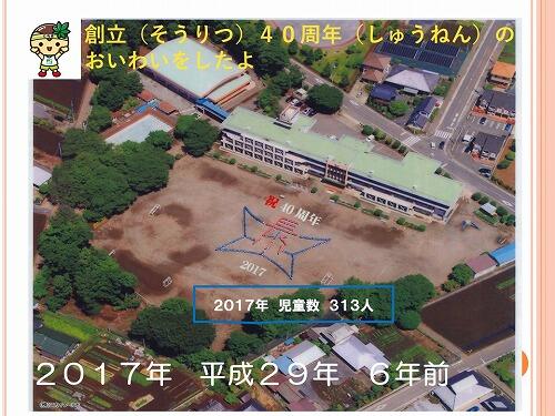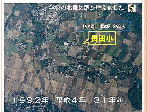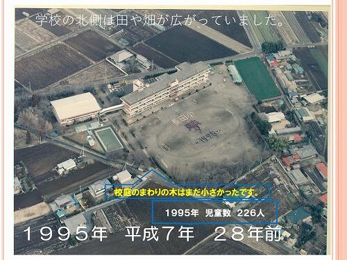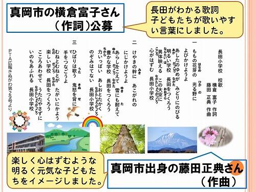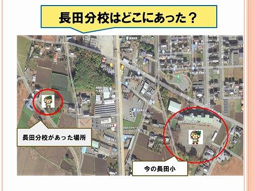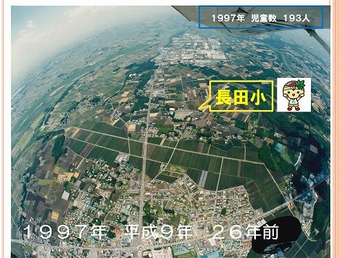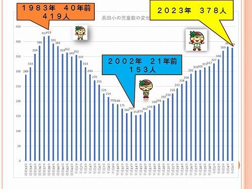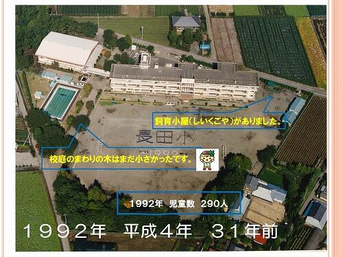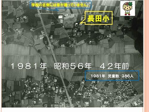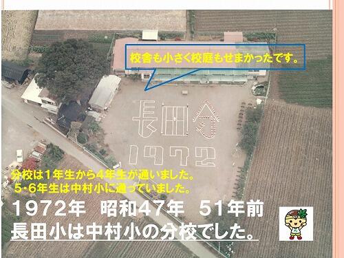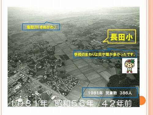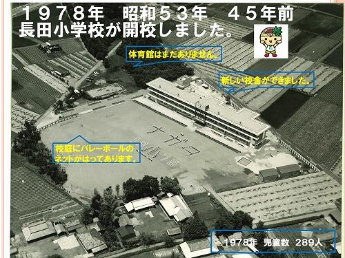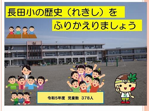 長田小は昔、中村小の分校で、長田分校でした。長田分校が長田小になったのは、昭和53年、今から45年前でした。開校当時児童数は289人。開校から2年後に校歌、校章、3年後に体育館ができました。開校3年後の児童数は386人と今と同じくらいの人数でした。令和2年に新校舎ができ、校舎が大きくなりました。校章に込められた願いについても話をしました。(詳しくはスライド画像をご覧ください。)今年は、開校から46年がたちますが、開校当時の地域や保護者、学校職員の願いや思いを再度振り返ることで、長田小のあゆみの中に今の自分たちも存在することを実感し、未来に進んでほしいと思い、お話をしました。