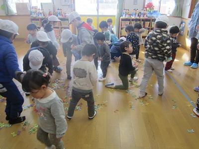 詩や歌を披露し、折り紙で折ったメダルを一人一人にプレゼントしました。その後、年長組、年中組、年少組に分かれて室内遊びをしました。はじめは、なかなか声をかけられずに見ているだけの2年生でしたが、徐々に声をかけたり遊んだりすることができました。