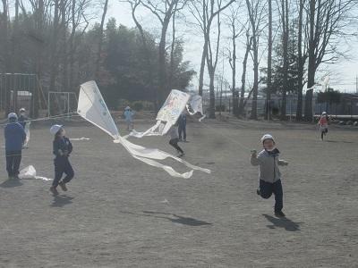 生活科の時間に、みんなで作った「たこ」をあげました。「たこ」をあげていて、どんどん高く上がっていく様子を見て、子どもたちはとても喜んでいました。友達にも、「見て見て、こんなにあがったよ。」と声をかけている姿が見られました。みんな一生懸命にたこあげをしていました。