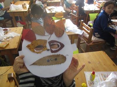 生活科の時間に、落ち葉や木の実を集めてお面づくりをしました。寒くなって落ち葉の色が変わり、「落ち葉の色が変わったね。」と季節の変化を感じながら、お面づくりに使う材料を一生懸命に集めました。自然のものから作るお面は、子どもたちも楽しんで取り組んでいました。また、いろいろな変化に気付ける大切な生活科の学習となりました。