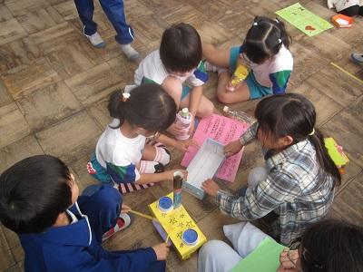 2年生のおもちゃランドに招待されました。2年生の作ったおもちゃで、1年生は説明を聞きながら遊びました。手作りのおもちゃは、1年生の子どもたちにとっては、とても新鮮で楽しく遊ぶことができました。