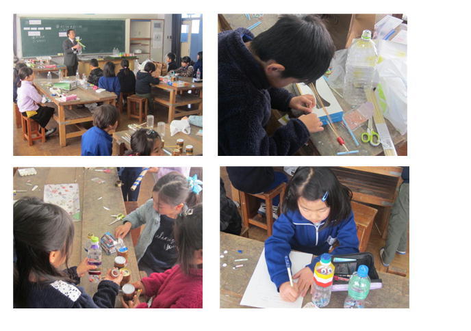音を鳴らして試しながら、材料の使い方や飾りなどを工夫して楽器を作る授業です。