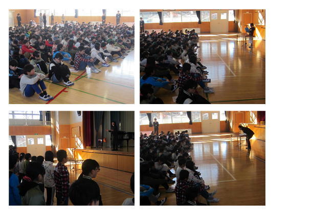 (校長の話、児童代表3名による学期の振り返りと3学期の目標の発表、校歌斉唱)