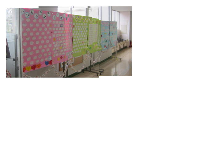 学年ごとに感謝カードを模造紙1枚にまとめて校長室前の廊下に掲示しています。ご来光の際にご覧いただけたら幸いです。