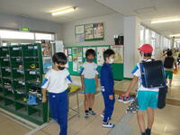 長田小学校では、児童に生活習慣の基本を身に付けさせるため、「4つの『あ』(あいさつ あつまり あるき方 あとしまつ)」を合い言葉に指導しています。今週は、あいさつ強調週間です。生活掲示委員会の児童が朝、昇降口に並び、登校してくる児童に「おはようございます」と声かけをしています。委員の子どもたちに刺激を受け、いつもより大きな「おはようございます」の声が 昇降口に響きました。