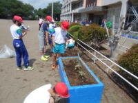 花壇の除草をした後、ひまわりとマリーゴールドの苗を植えました。高学年が作業の手順を説明し、下級生は作業の仕方を上級生に教わりながら、一生懸命活動していました。