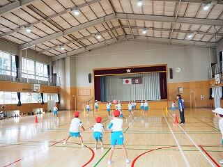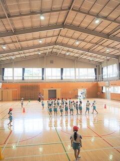 1年1組 体育 LEⅮ照明になった明るい体育館でドッジボールをやりました。