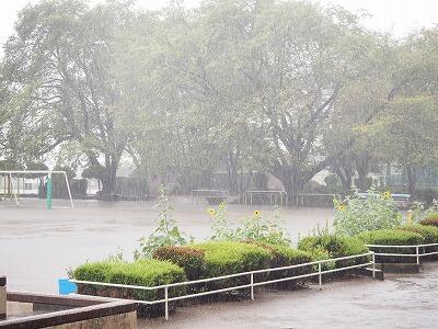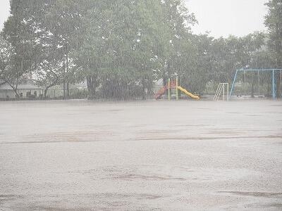 4時間目の校庭 大粒の雨が北から吹きかけ、校庭は海のようになりました。