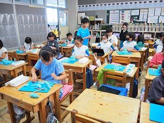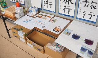 1年1組 図工 絵の具の使い方を初めて学習しました。絵の具セットに入っている道具の名前や机上への置き方、使い方などを学びました。