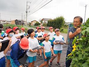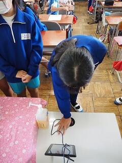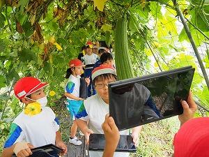 4年1組 理科 ヘチマの花や実を観察しました。大きくなったヘチマの実を見て驚いていました。成長の様子をタブレットPCで写真を撮って記録しました。