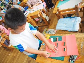 2年1組  図工 「まどからこんにちは」カッターナイフを使って作品を作りました。