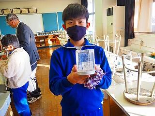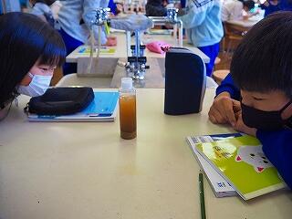 6年1組 理科 地層のでき方 実験でペットボトルの中に地層を作りました。