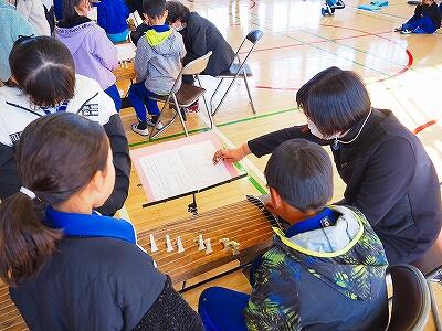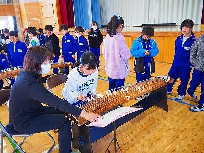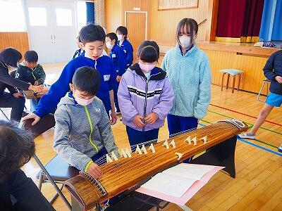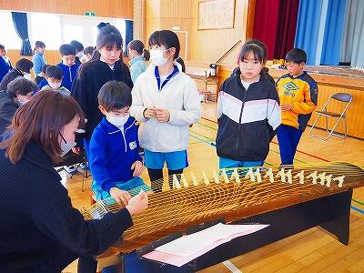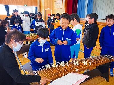 4年生は、箏に触れて実際に演奏する体験もしました。箏の音色を近くで初めて聴く児童も大勢いました。