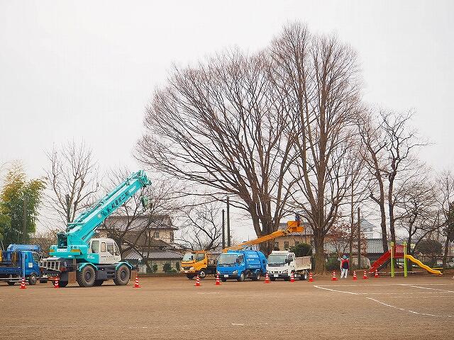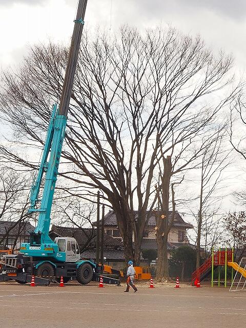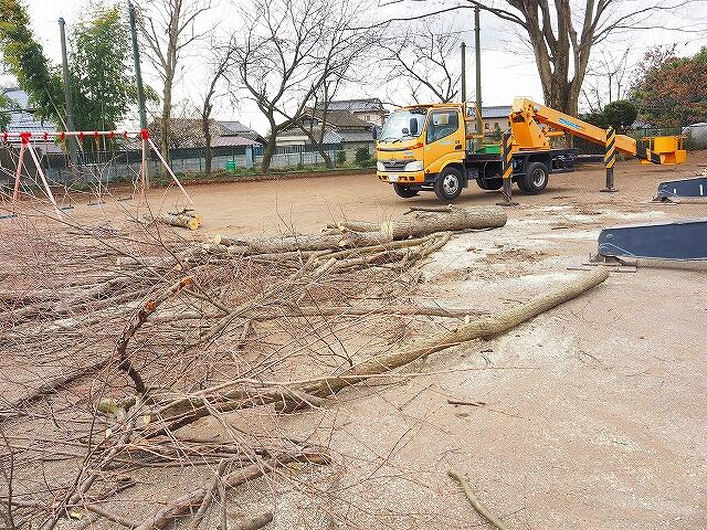 長田小校庭の樹木の伐採作業を本日と明日、行います。今日は校庭南の2本の「けやき」を伐採しました。高所作業車や大型トラック、パッカー車が校庭に入り、作業を行いました。