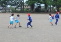 鬼ごっこをしています。鬼に捕まらないよう、子どもたちは走る速さや方向に変化をつけたり、身を翻しながら 無意識にサイドステップやバックステップなど 様々な走り方を使ったりして必死にかわそうとします。運動量も多いので、鬼ごっこは単なる遊びではなく、運動効果の高い活動として注目され、体育の授業の中に取り入れるよう推奨されています。