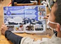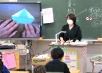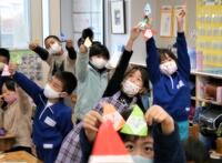 教科書の「きせつだより(冬)」のページを開き、冬と言ったら頭に浮かぶものについて話し合いました。いろいろ出た中からみんなで選び、サンタの飾りを折り紙で作ることになりました。先生に折り方の説明を教えてもらいながら まず1つ、次は折り方を思い出しながら自分だけで もう1つ作り、気に入った方を廊下に飾りました。