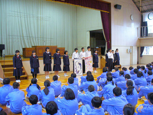 校長先生による学校の記念品交換。