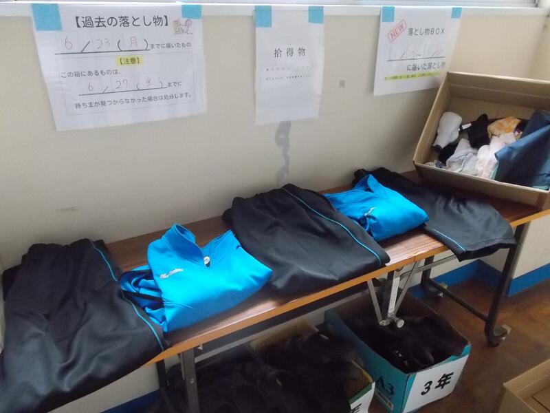 職員室前の廊下に「落とし物」がおいています。ハンカチや櫛など小さな物もいくつかありますが、大切な「運動着」も置かれています。上着が2着、長ズボン2着、半ズボン1着です。