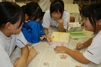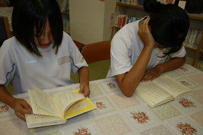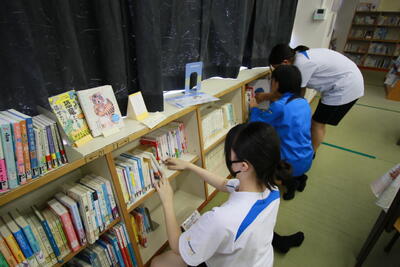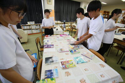 姉妹校交流海外派遣に参加する生徒が調理室に集まってTシャツ作り(図柄選び)を行っていました。着実に準備が始まっています。また、雨のため図書室にはいつもより多くの生徒が集まっていたので、写真を撮ってみました。