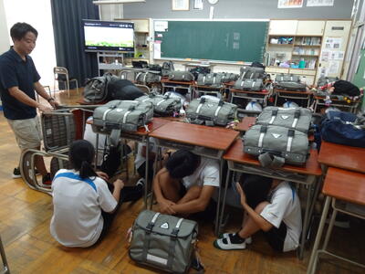 9月12日(金)に竜巻の発生を想定した避難訓練を行いました。自分たちの身を守るための避難の仕方を学ぶととともに、動画等を見て大きな被害に至った場合の危険性について学びました。