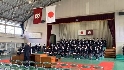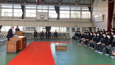 卒業式予行のあと、中村中学校同窓会長 橋本文雄 様をお招きして、同窓会入会式を行いました。