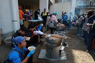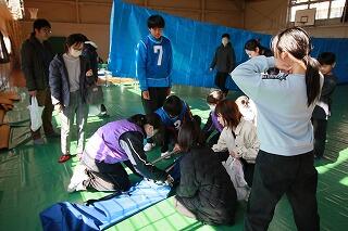 2月16日(日)に開催しました防災キャンプに際しましては、休日にもかかわらず多くの生徒そして保護者の方々にご参加いただき心より感謝申し上げます。コミュニティスクールの設立に伴って、学校を地域全体で運営する「学校運営協議会」の委員が主体となって企画・運営するキャンプでした。当日は、2月とは思えないほどの暖かい日で、多くの小学生や地域の方々にもご参加いただき、想像を超える賑やかな防災キャンプとなりました。避難所設営では、防災倉庫に保管されている簡易ベットなどを組み立てたり、いかにしてプライベートスペースを確保するかなどの取組をしました。交流活動では、小さい子から高齢者が一緒に楽しめるゲームを行い、小さいお子さんと高齢者の方がハイタッチする場面なども見られました。消防体験では、消防のコスチュームを着て消防車に乗ったり、ホース投げ競争なども行われました。中村地区の消防団の方々、総勢30名ほどが運営に携わってくださいました。炊き出しでは、前日から準備をし、すいとん汁が参加者に振る舞われました。深いだしの味とすいとんの柔らかさが引き立つ、食べたことのないようなおいしいすいとん汁でした。今回の防災キャンプに課題がなかったわけではありません。しかし、何よりも中村地区の様々な年代の方々が学校という場に一同に集い、交流し、笑顔を交わし、知り合いになれたことが何よりの収穫でした。学校運営協議会委員の皆様、炊き出しにご協力頂いた婦人会の皆様、消防団の皆様を始め中村地区の皆様に、そして主体的に参加し取り組んでくれた中村中学校生徒ボランティアに、心からの感謝の気持ちをお伝えさせていただきます。