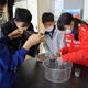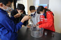 グループごとに地層のでき方を確かめる実験をしました。写真は、実験の様子を動画にとっているところです。