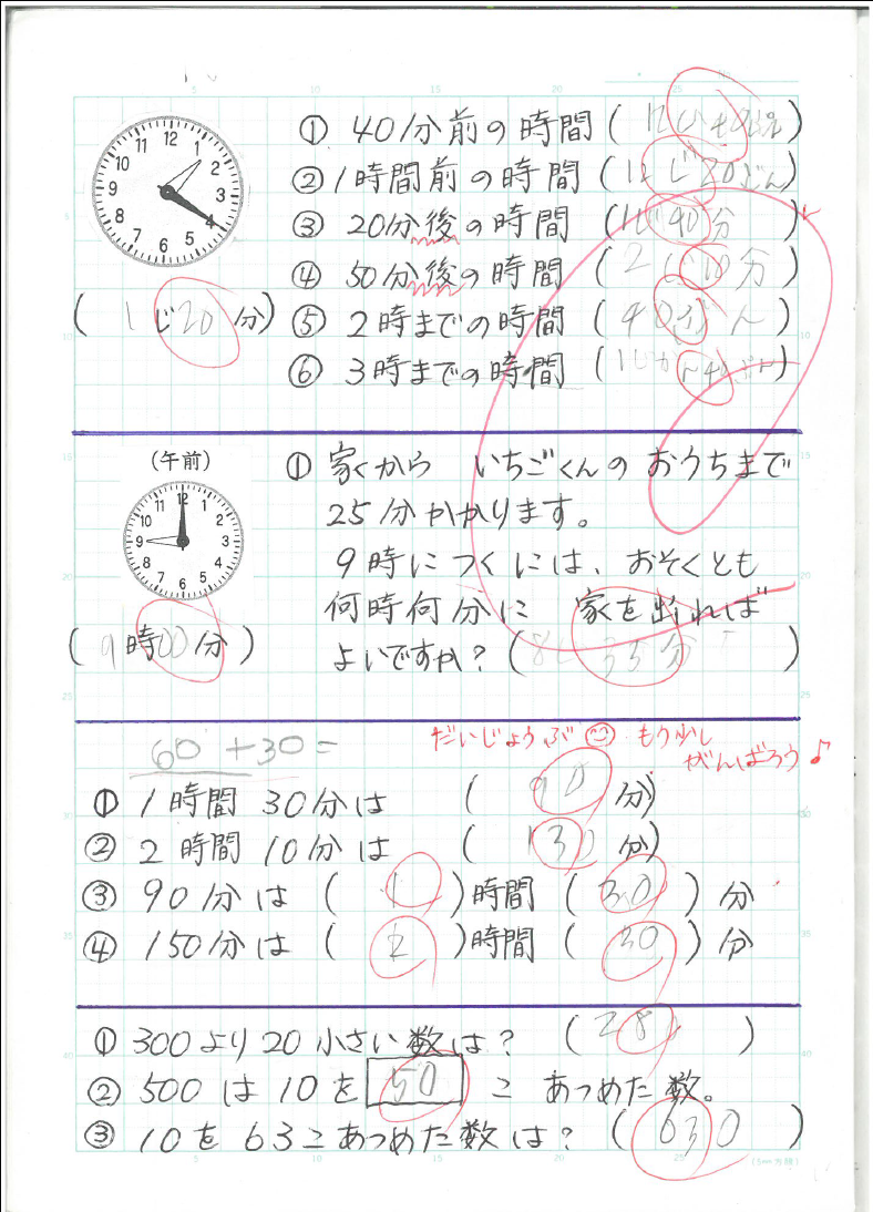 ○家庭学習ノート(自主学習ノート)は、親に提出する習慣を付けましょう。毎日目を通し、できていないところはきちんとやり直しをさせ、励ましや助言など親のコメントを記入しましょう。