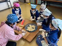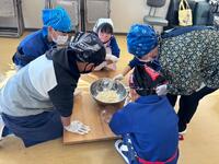 宿泊学習2日目です。ふれあい活動では、「うどん」「バウムクーヘン」「まんじゅう」「いももち」を作り、食べました。準備、後片付けなど協力して行いました。