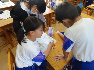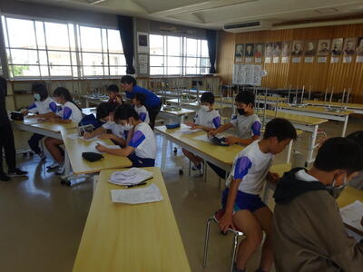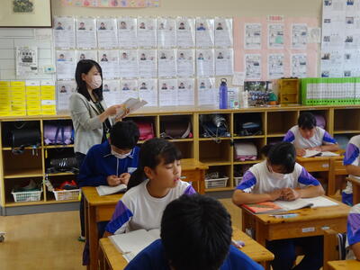 外国語活動では、AETやJTEと一緒に活動しています。3年生はハロウィンカードを作成し「形」の言い方を学習していました。5年生の家庭科では、お米のとぎ方と炊き方の学習でした。また、来週の木・金曜日には、全学年で学力調査を実施します。これまでの学習内容から出題されます。教室でも復習問題に取り組んでいますが、家庭でも声かけ等をお願いします。