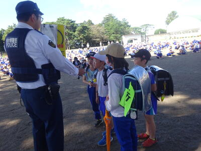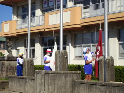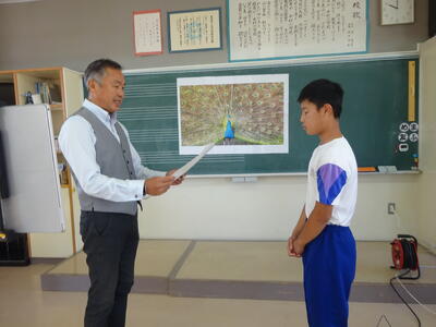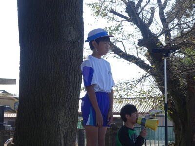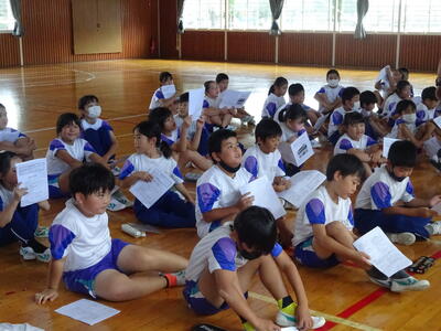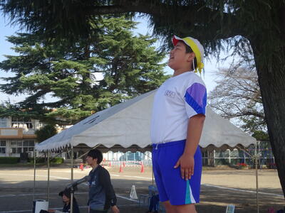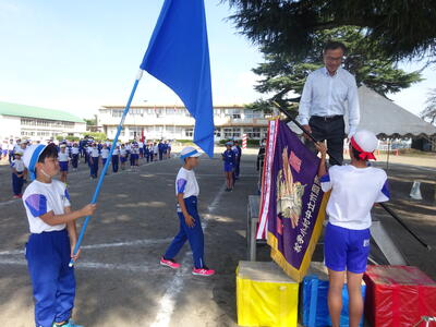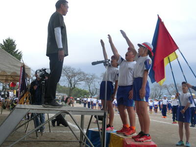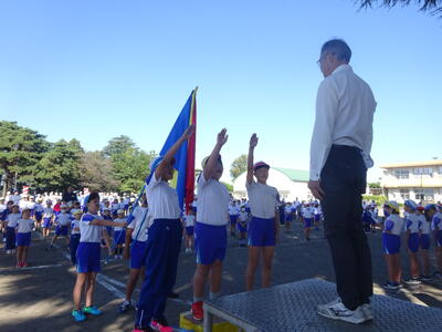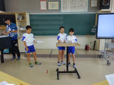 賞状伝達では、陸上で全国大会100メートル5年男子での入賞者と、軟式野球大会で全国1位をとって市長功労賞を受賞者の表彰がありました。校長講話では、運動会に向けてスローガンを合言葉に全力で取り組もうと話がありました。
