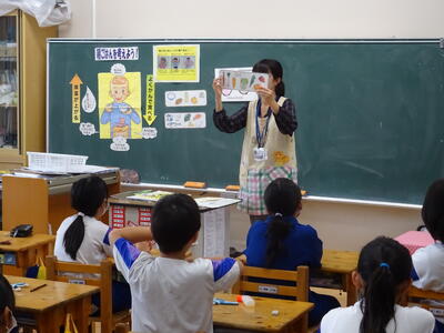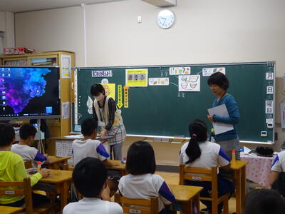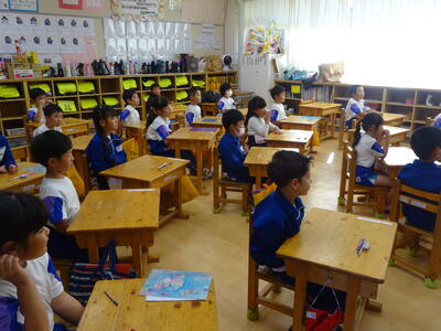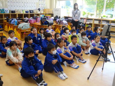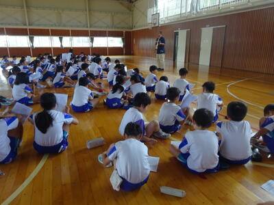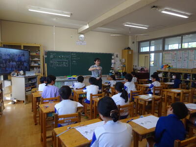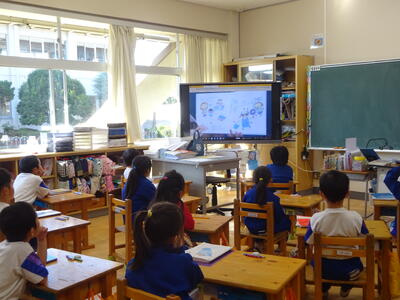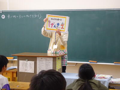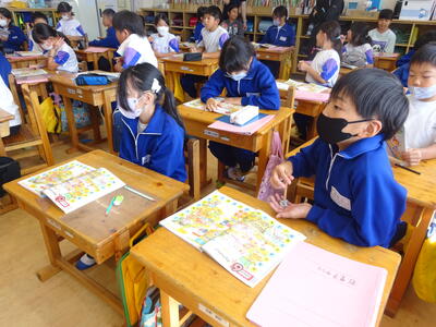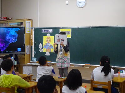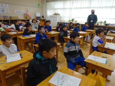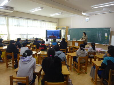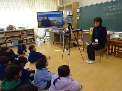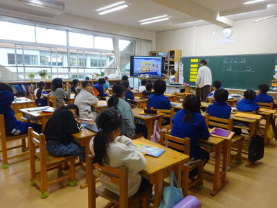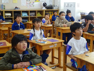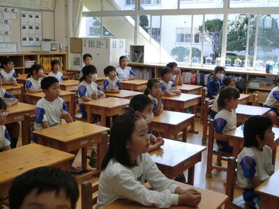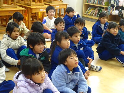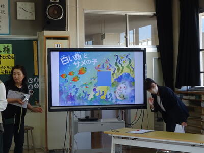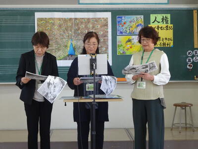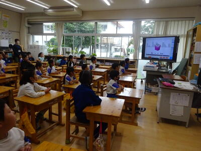 人権擁護員さんをお招きして人権教室を行いました。人権擁護員さんから人権を守ることの大切さや人権のマスコットの紹介がありました。紙芝居では、「白い魚とサメの子」という話を聞きました。金子みすゞの詩の朗読もありました。各教室の子どもたちは、真剣な態度で参加していました。