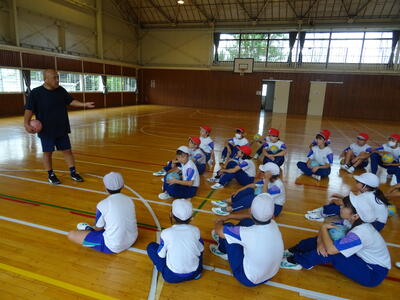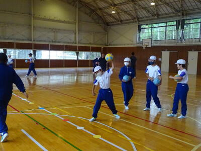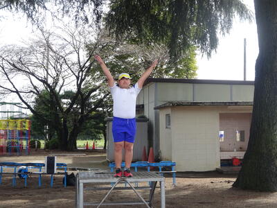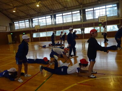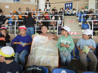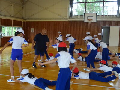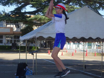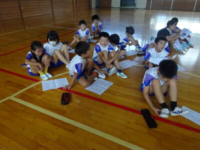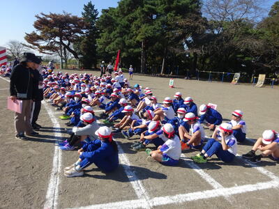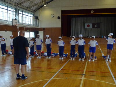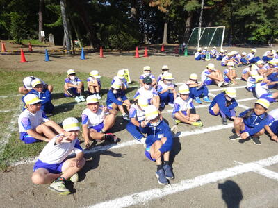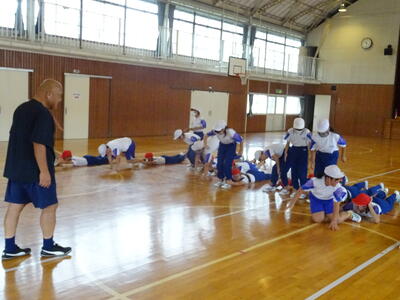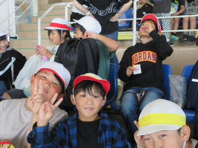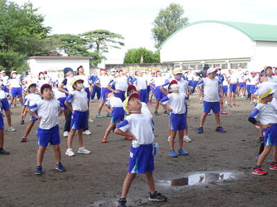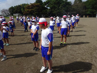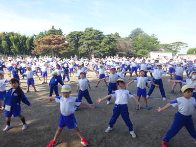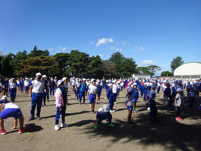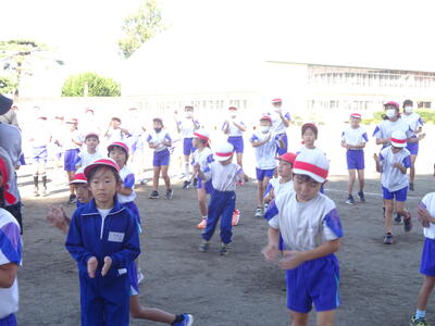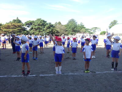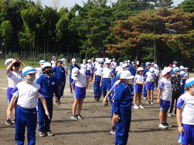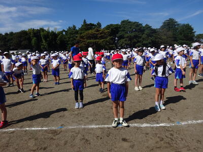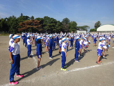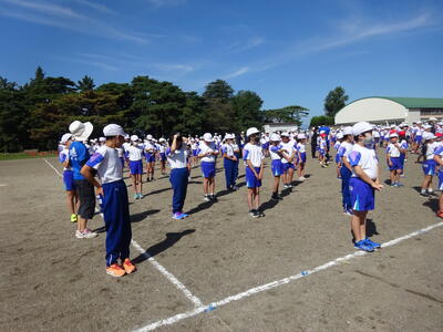 全校でのラジオ体操の練習です。各クラスで練習してきたこともあり、代表の動きを見てしっかりと体操できていました。ハチマキも帽子に縫い付けてもらい、だんだんと運動会らしくなってきました。