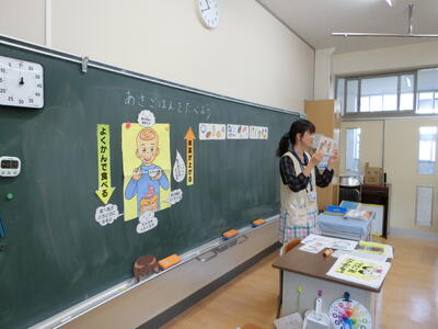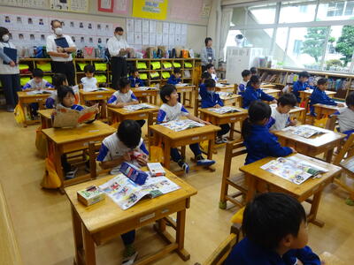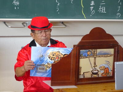 ボランティアの方による読み聞かせがありました。高学年は「うしかたとやまんば」を紙芝居にして、低学年は「100円たんけん」「ながーい5ふんみじかい5ふん」「パンのおうさまとシューパン」を読み聞かせしていただきました。