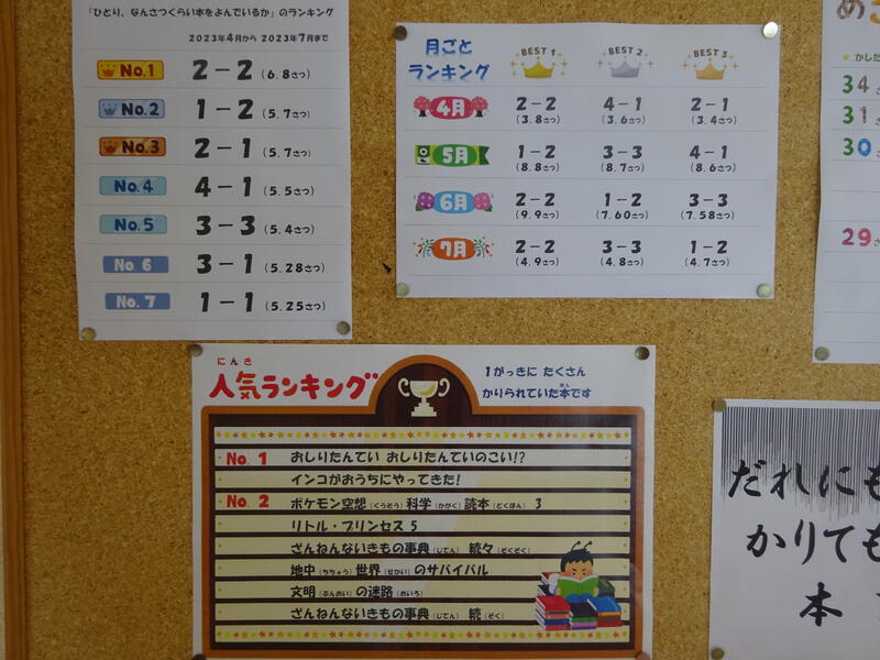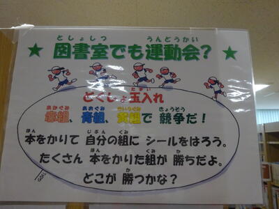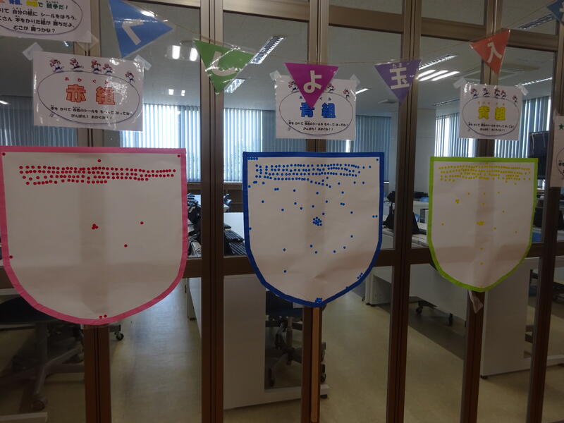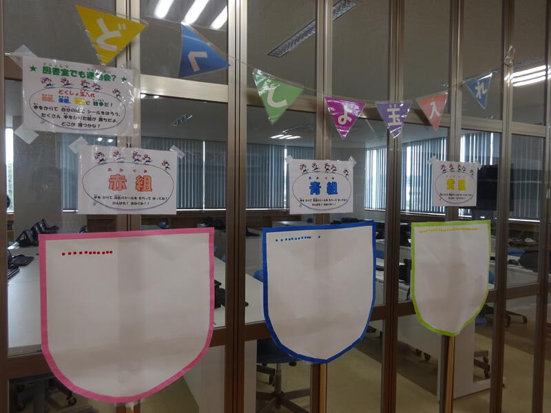 今のところ、青組が優勢のように見えます。赤組、黄色組もがんばってください。図書館には、おもしろい本やためになる本がたくさんあります。どんどん借りにきてください。