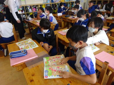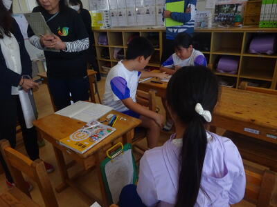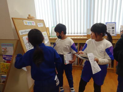 先日の「読書玉入れ」の結果は読書集会で発表されます。現在は「読書でビンゴ」でいろいろなジャンルの本が読めるように挑戦したり、オリジナル本を作って紹介したりする活動に取り組んでいます。