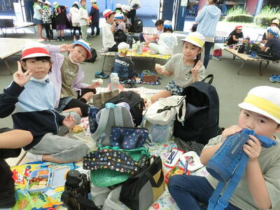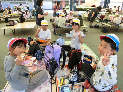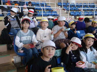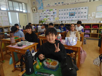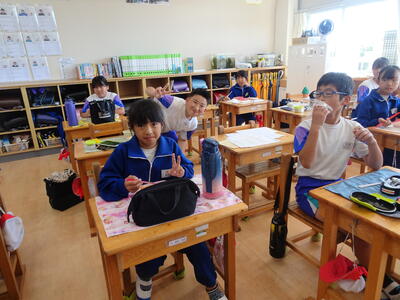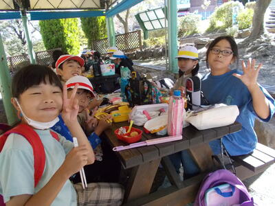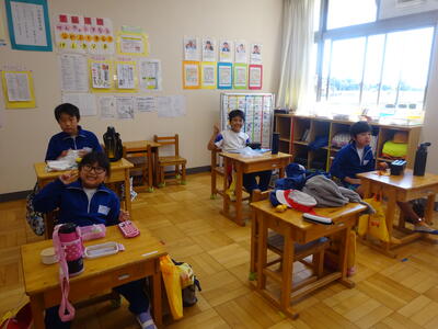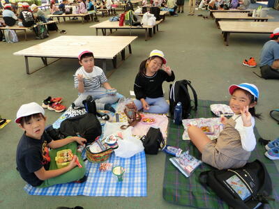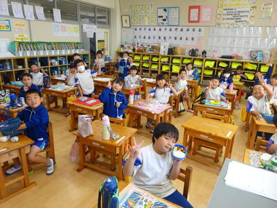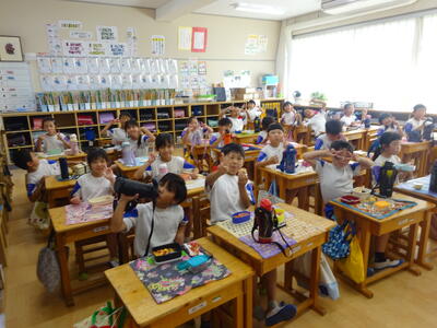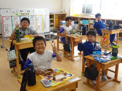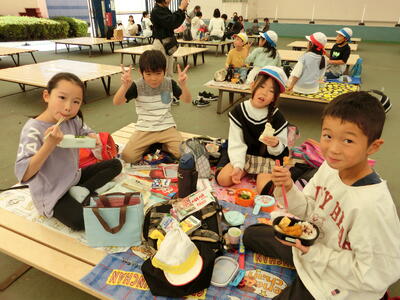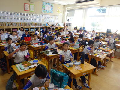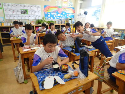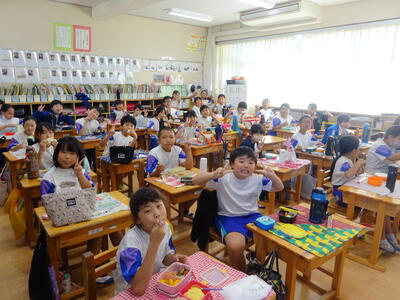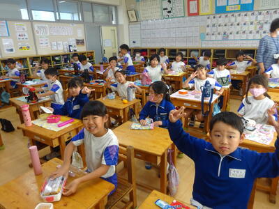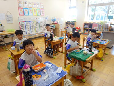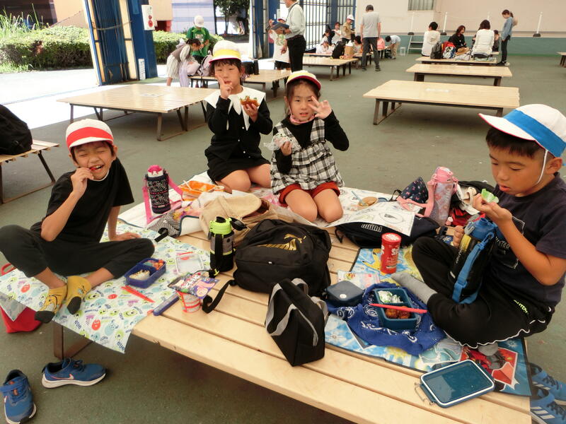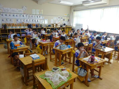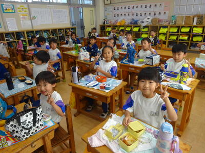 お弁当の日の教室はいつも嬉しそうな笑顔でいっぱいです。1年生は自分のお弁当が自慢のようです