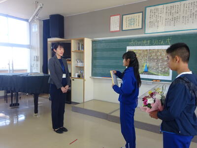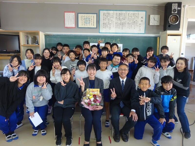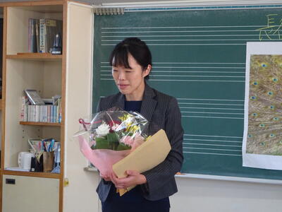 養護の先生の離任式がありました。短い間でしたが、日々の児童の健康管理や6年生の修学旅行、運動会等で大変お世話になりました。6年生の代表児童からのあいさつやお手紙・花束の贈呈がありました。