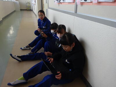廊下に待っている児童は、読書したりタブレットをしたりしています。