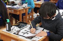 今日は書初めです。「正月」という文字を、はね、曲がり、バランスに気をつけて練習しました。